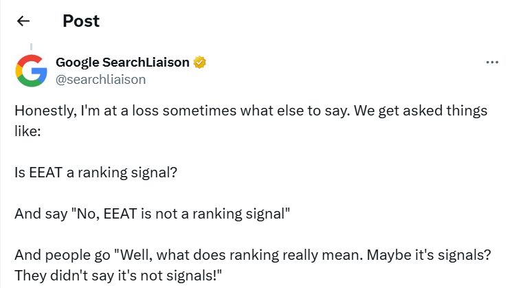 You don’t have to take our word for it. Google’s own Search Liaison, Danny Sullivan, has clarified this multiple times. In a widely cited statement, he confirmed that E-E-A-T is not a direct ranking factor: